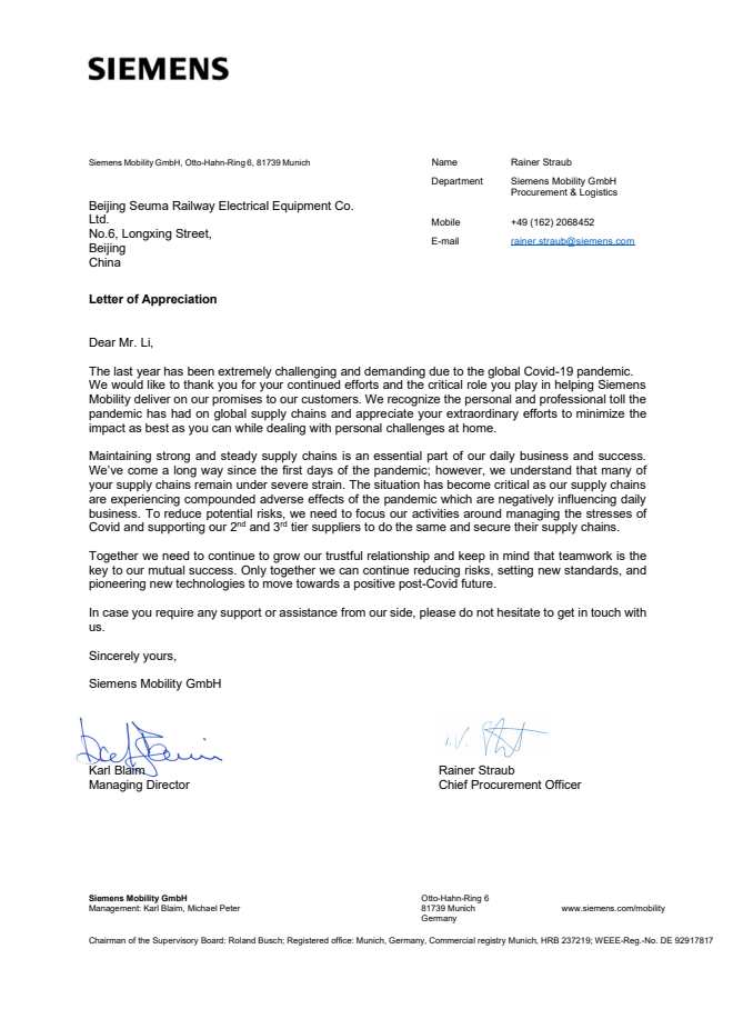 北京森瑪鐵路電氣設(shè)備有限公司成立于2007年6月,注冊(cè)資金330萬美元,是一家生產(chǎn)鐵路電氣化設(shè)備的德國(guó)獨(dú)資企業(yè),擁有獨(dú)立的進(jìn)出口經(jīng)營(yíng)權(quán)。公司占地面積6000㎡,辦公及生產(chǎn)面積3000㎡。2008年5月公司通過德國(guó)萊曼博士認(rèn)證機(jī)構(gòu)DIN EN ISO9001:2000認(rèn)證。2011年1月通過ISO9001質(zhì)量管理體系認(rèn)證,于2018年11月成為北京市高新技術(shù)企業(yè)。